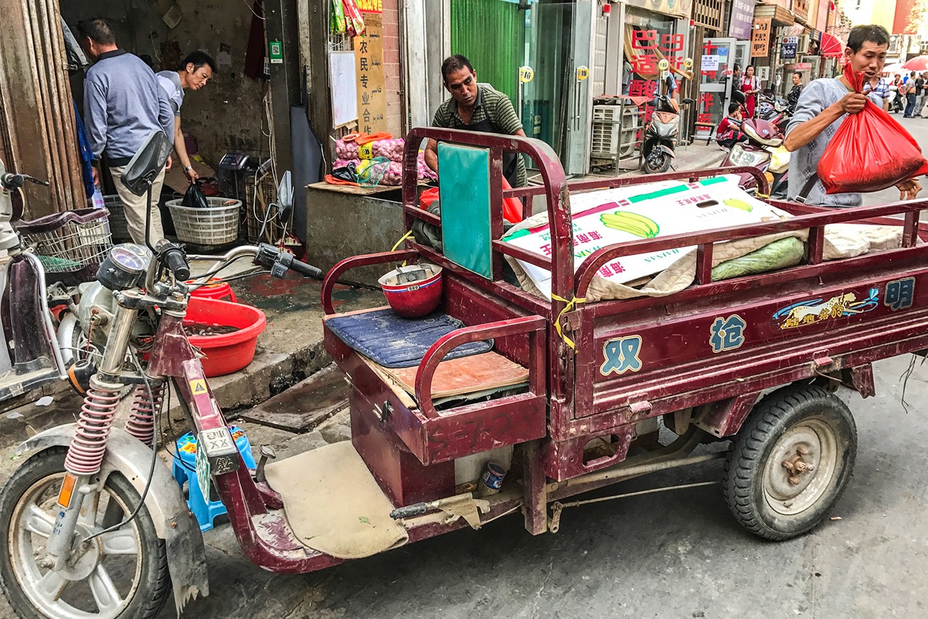 なんと、驚いたことにこの街を走っている自転車やバイクは電動!この写真のボロボロの荷台付きバイクも電動なんです。