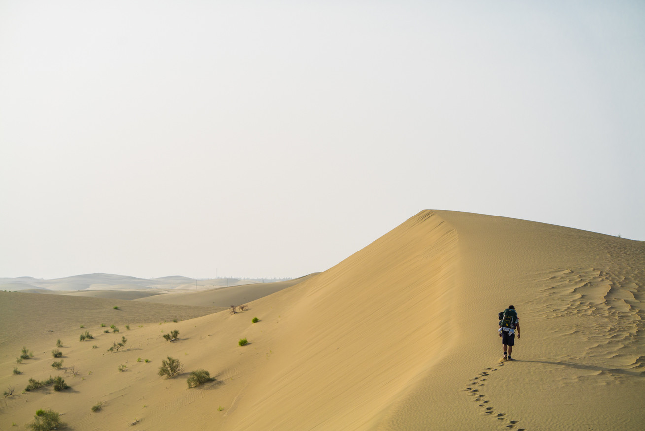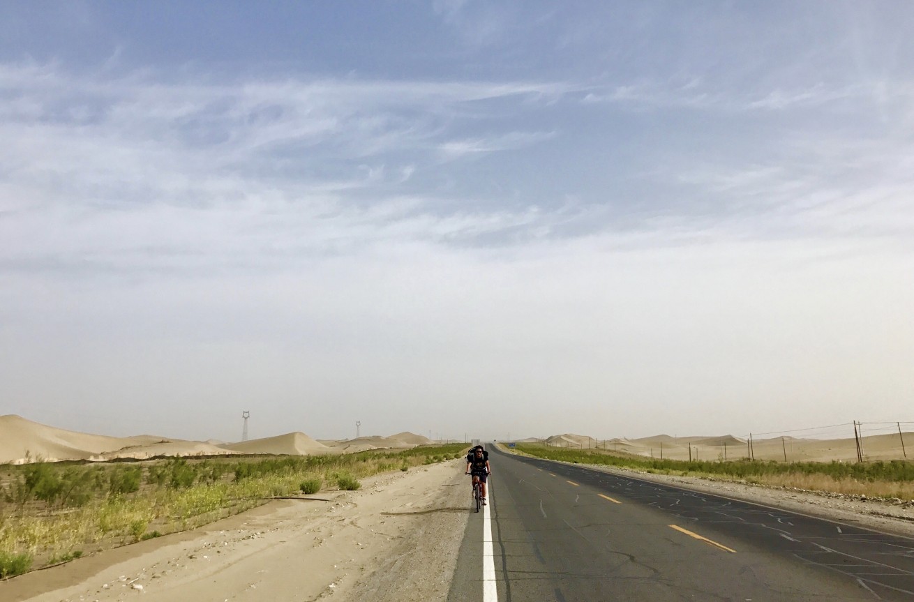 ホータンから伸びている砂漠を横断する道を20kmほど進みます。もうすでにまわりには広大な砂丘が広がっています。最果て感がハンパない。