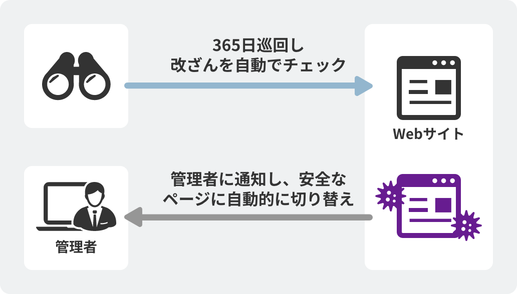 Web改ざん検知目視では判断できない改ざんを自動で検知。被害を最小限にくい止め、企業の信頼を守ります。