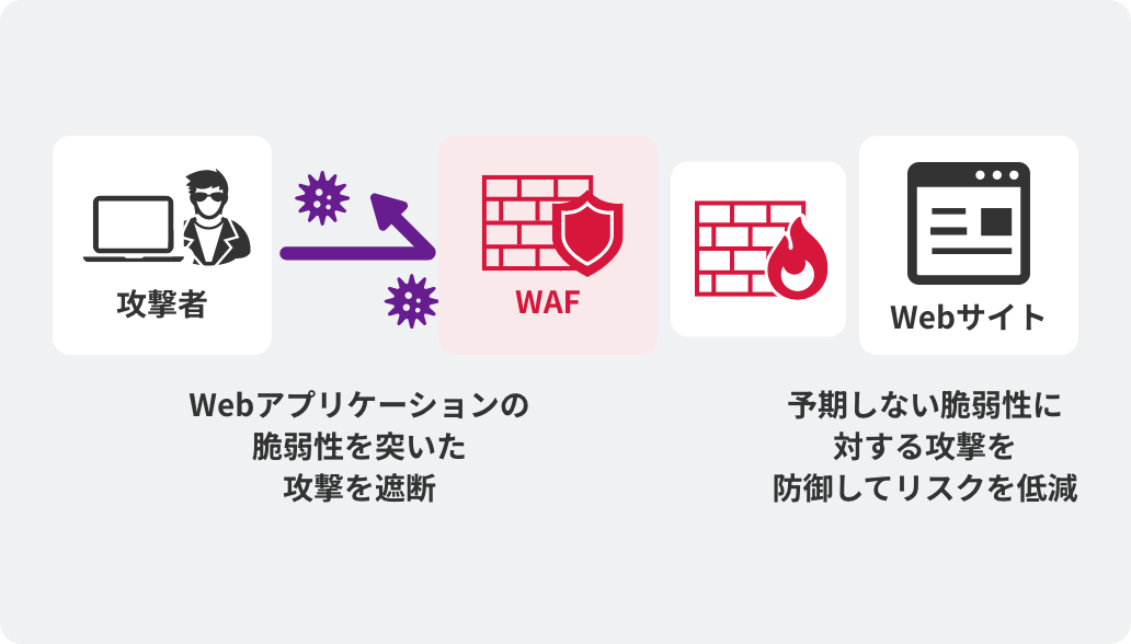 WAF(Web Application Firewall)通常のファイアウォールでは防ぐことができないWebアプリケーションへの攻撃を遮断します。