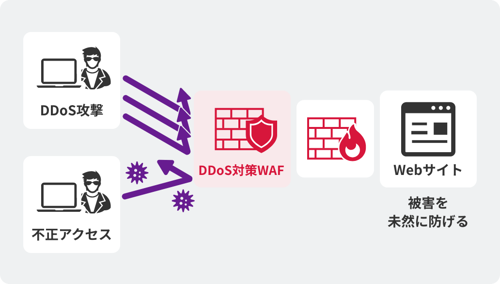 DDoS対策WAFDDoS攻撃や不正なアクセスを検知・遮断します。 Webサイトへ送られたデータの内容を1つ1つリアルタイムに解析するため、DDoS攻撃への対策として最も効果的です。