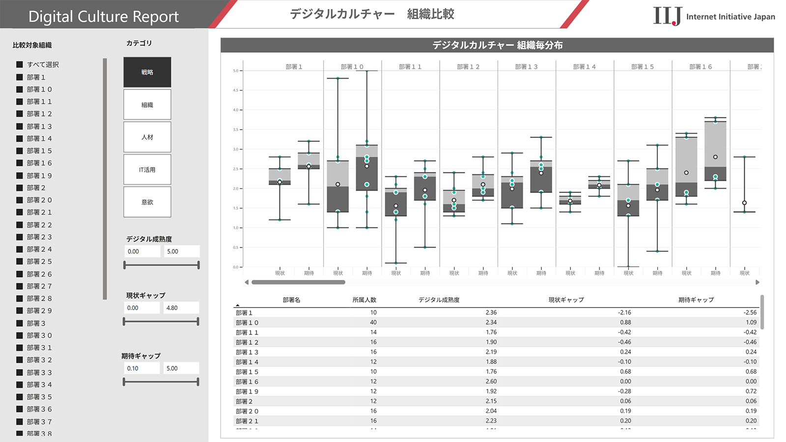 IPA(情報処理推進機構)の「DX推進指標」に準拠した5つの軸で設計された「実態調査アンケート」によってデジタル活用の現状と期待を組織別に診断。ギャップを可視化し、改善の方向性を提示します。