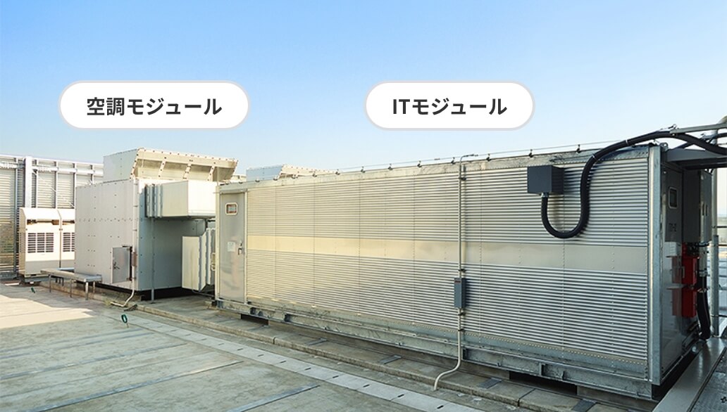 ITモジュールと空調モジュール(直接外部冷却方式)で構成され、大量のIT機器を効率よく収容できます。