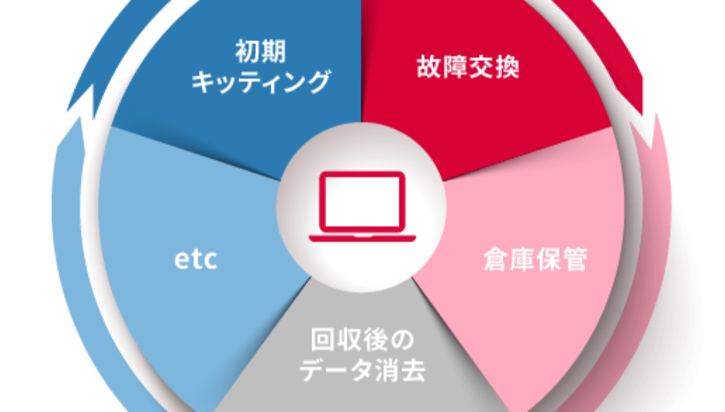 PC管理を楽にするライフサイクルマネジメント初期キッティングに加え、倉庫保管・故障交換・回収後のデータ消去など、デバイスLCMを支援します。