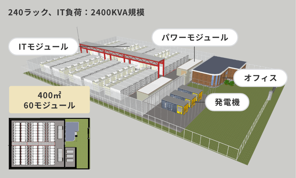 モジュール構造で、1ラック10kwで高密度にIT機器を実装することが可能な設計です。