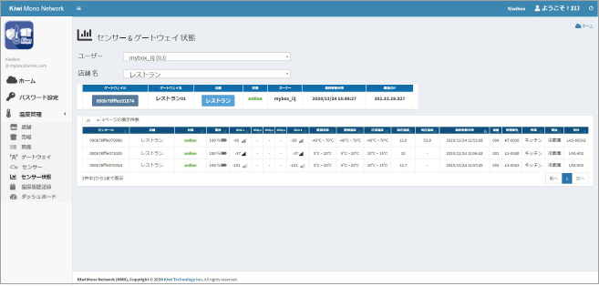 | 表示ステータス | センサー | センサーID/店舗名/通信状態/電池残量(%)/電波強度(RSSI)/ 警報温度(下限・上限)/適正温度(下限・上限)/霜取温度/定時測定温度 |