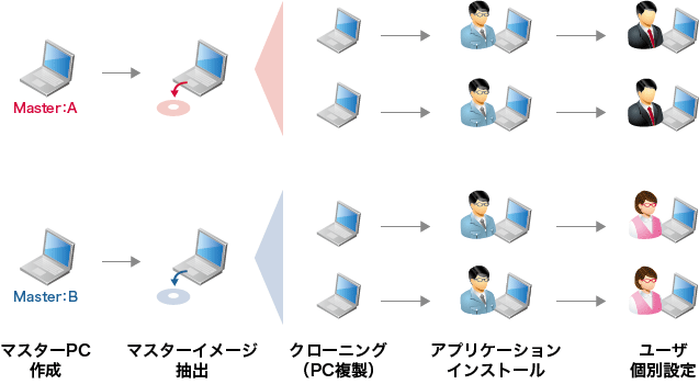 PCの調達からキッティング、マスターイメージの展開、ユーザへの機器配送までワンストップで提供します。