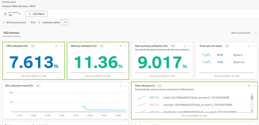 サーバ、コンテナ、POD等のインフラリリースから情報を収集し、監視する機能を提供します。エージェントのインストールだけで監視設定が不要となり、取得できるすべてのメトリクスを最小1秒単位で収集可能です。