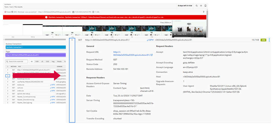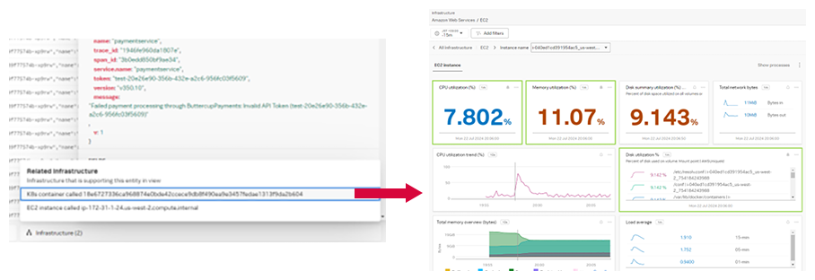 また、関連するログやインフラリソースを合わせて確認できるため、原因が容易に特定できます。