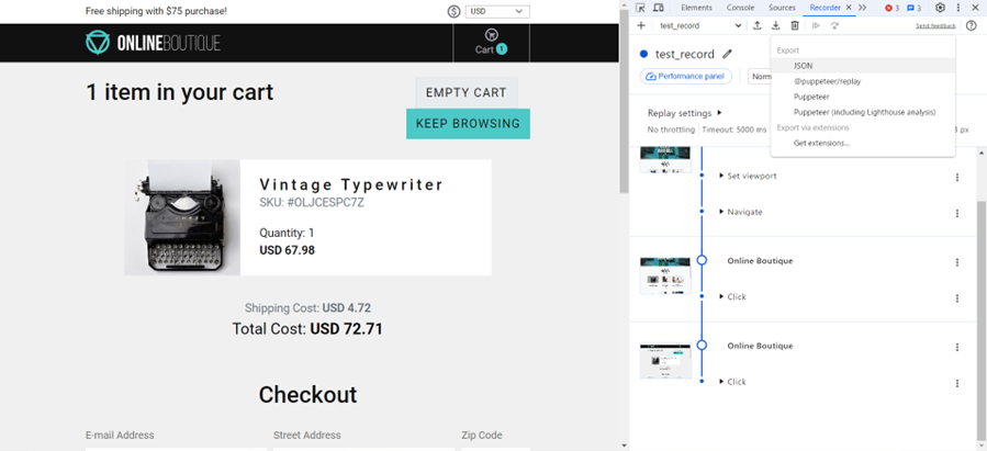 テストシナリオは、Google ChromeのRecorder機能を使用することで、ユーザの操作をそのまま記録し、シナリオに反映させることが可能です。