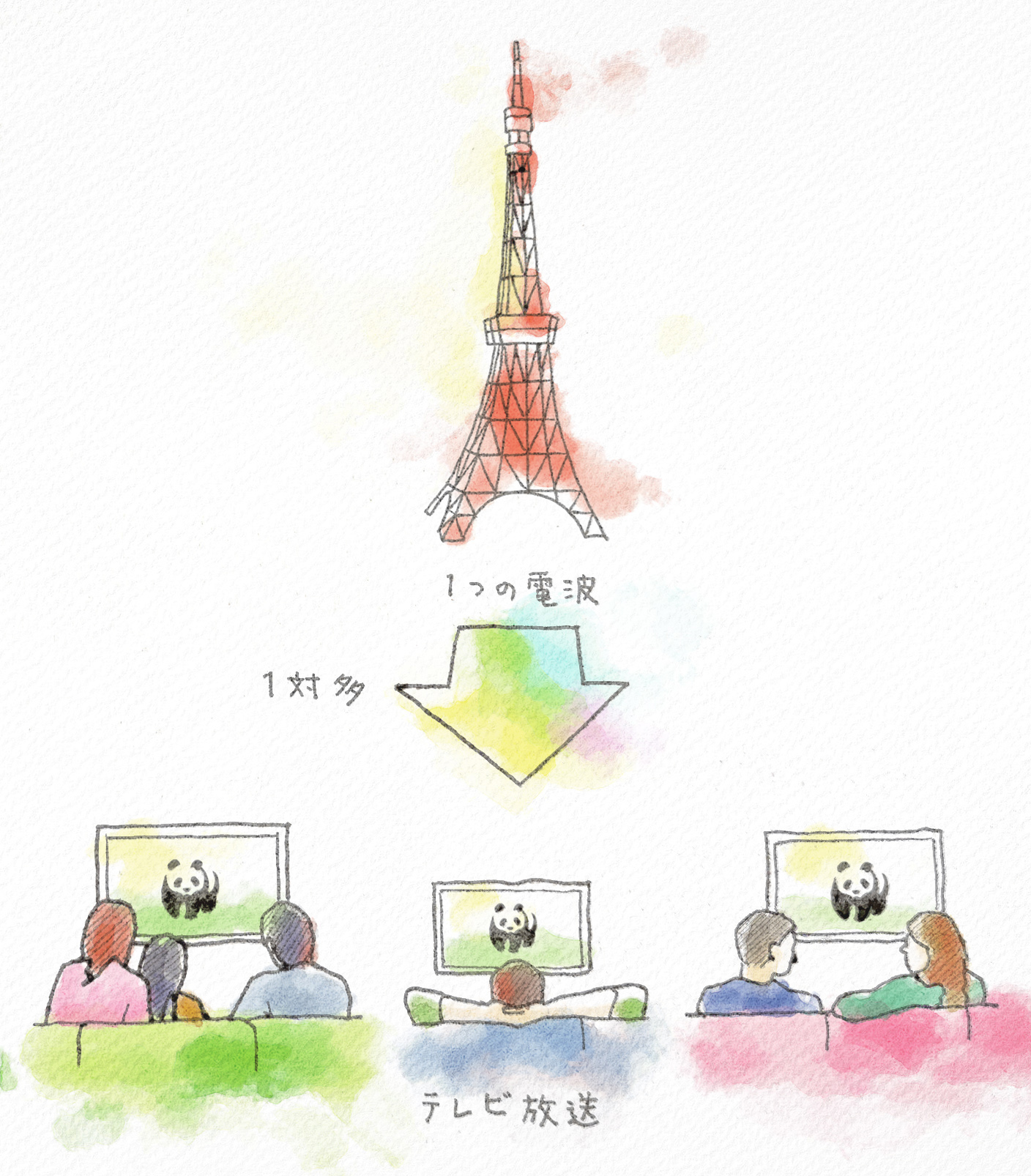 テレビ放送では、番組は各地に建てられた放送用のアンテナから電波によって送信されます。ここで重要なのは、あるチャンネルについて送信される電波は一種類と言うことです。テレビ放送では、放送局が送信した一種類の電波を視聴者全員が受信する「一対多」の関係となっています。