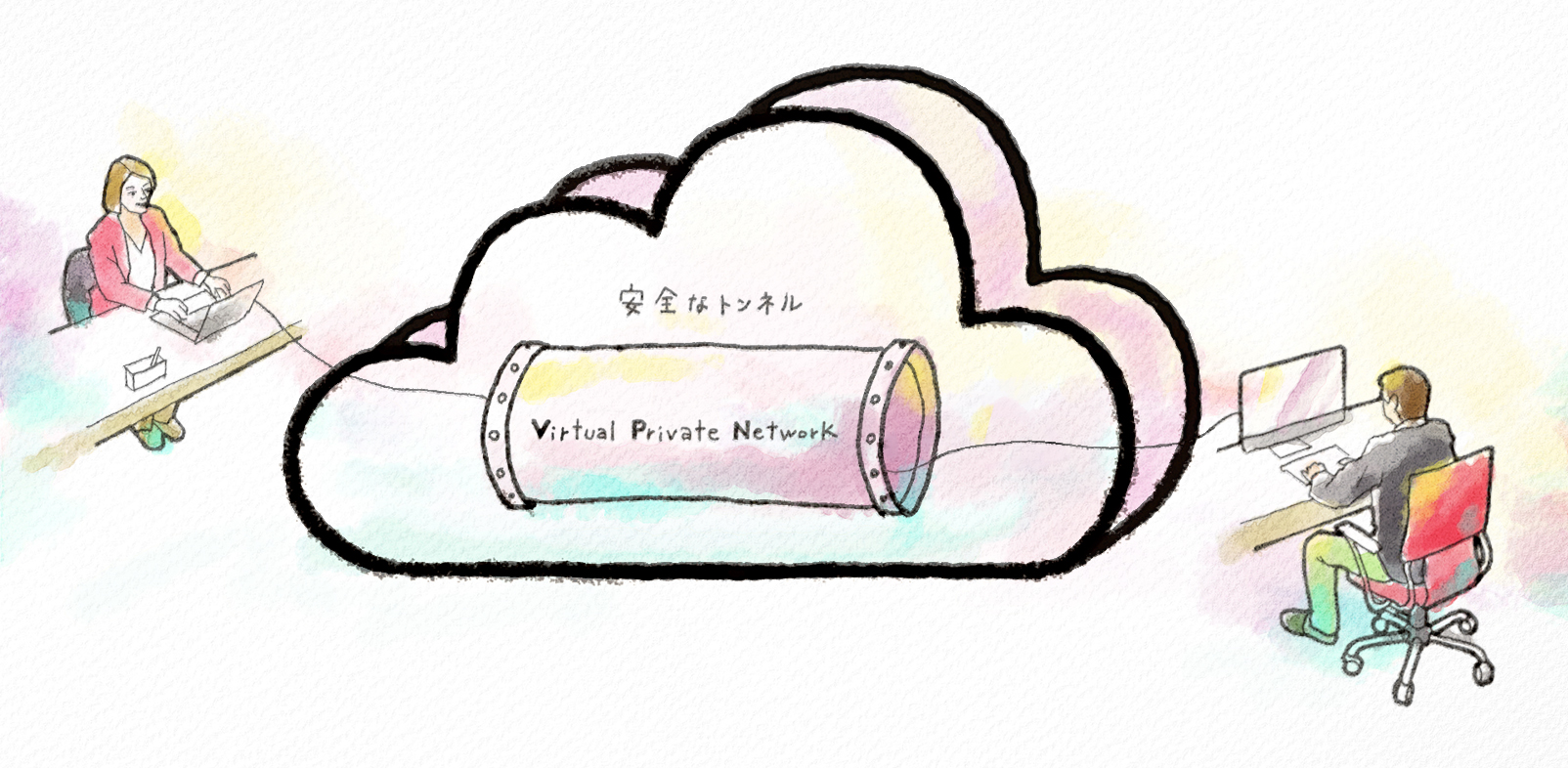 簡単に言うと、データを送る時に暗号化して鍵をかけ、データを受け取ったら、対になった鍵で暗号化を解除する仕組みです。これにより、あたかも専用線を使っているように、他者からは「見えない」通信が実現できているのです。