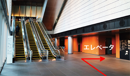 - (2)オフィス棟 1Fエスカレーター右にあるエレベーターで2Fに上がり、IIJ受付へ。