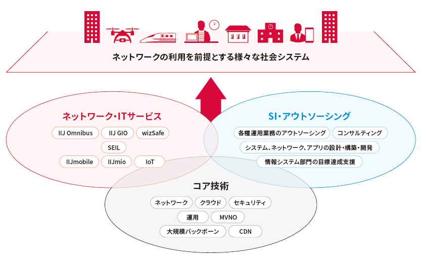 IIJは創業以来、社会の需要を先取りし、革新的な技術を標準化して、多くのネットワークサービスを世の中に送り出してきました。また、システムインテグレーション(SI)や運用で得た知見を活かし、お客様に必要とされるITサービスを創り出してきました。