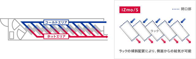 コンテナ内部を、IT機器を境にして2つの空間①「コールドアイル(Cold Isle)=IT機器の吸気側」と②「ホットアイル(Hot Isle)=IT機器の排気側」に区切り、コンテナ内の限られた空間で効率的に空気の流れを作り、空調効率を高めています。更に「IZmo/S」ではラックを斜め配置することで、側面からの冷気供給により効率的なIT機器の冷却を実現しています。