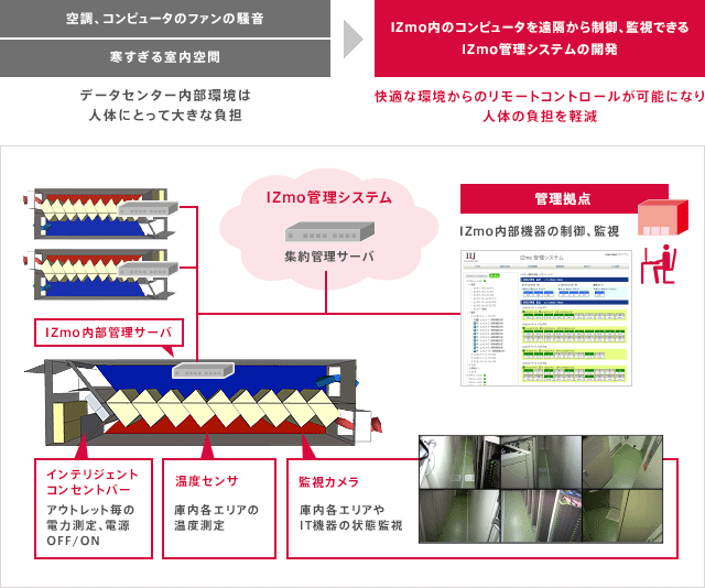 「IZmo」自体は建築物ではなく設備であり、普段は無人で運用する必要があります。「IZmo」は、このためのモニタリング設備や消火設備等を備えており、複数台の「IZmo」を統合管理するシステムを開発しています。