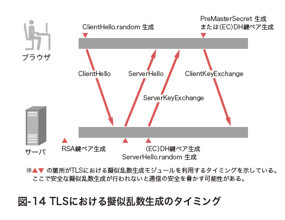 図-14はTLSプロトコルにおいて擬似乱数モジュールを使うフェーズについてまとめたものです。TLSを利用する前にサーバはRSA鍵ペアを生成しサーバ証明書を作成します。その際にはサーバが擬似乱数生成モジュールを用いて素数を生成しますが、前述したDebian OpenSSL問題のように十分なエントロピーを確保する必要があります。TLSプロトコルはクライアントとサーバそれぞれでHelloを送信することから始まります。ClientHelloおよびServerHelloのメッセージ送信においてそれぞれ28バイトのランダムデータを含むrandomを生成します。さらに鍵交換アルゴリズムとしてRSAを選択した場合には、46バイトのランダムデータを含むPreMasterSecretをClientKeyExchangeメッセージを通して安全に共有します。またDHEやECDHEを利用する場合には一時的なDH鍵またはECDH鍵を生成して鍵交換アルゴリズムを実行しPreMasterSecretを共有します。このとき一時的な(EC)DH秘密鍵の選択範囲が少ないと、解読される危険性が増します。最後にClientHello.random、ServerHello.random、PreMasterSecretの3つのランダムデータからMasterSecretを算出します。このMasterSecretから、クライアントとサーバそれぞれのMAC鍵、コンテンツ鍵、(CBC暗号モード利用時の)初期ベクトル(IV)を導出することで安全な通信を行うことができます。TLSでは複数のランダムデータを利用して暗号化用鍵を導出する構造を持つ設計がなされていますが、安全に擬似乱数生成ができない、つまり生成される値に偏りがあるケースにおいてはTLSが安全に利用できなくなる可能性があります。