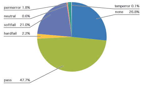 この利点もあり、SPFの導入率は、図-4をみても分かるとおり、非常に高い割合になっています。送信側でSPFを導入している割合は、認証結果が「none」(認証できなかった)以外の割合となり、今回の調査期間では73.2%でした。認証結果「pass」(47.7%)は、正しく認証されたメールの割合を示します。「hardfail」(2.2%)と「softfail」(21.0%)は、認証が失敗した割合となり、これらはドメインが詐称されたか、メールが転送などにより配送経路が変わって認証できなかったことを示します。