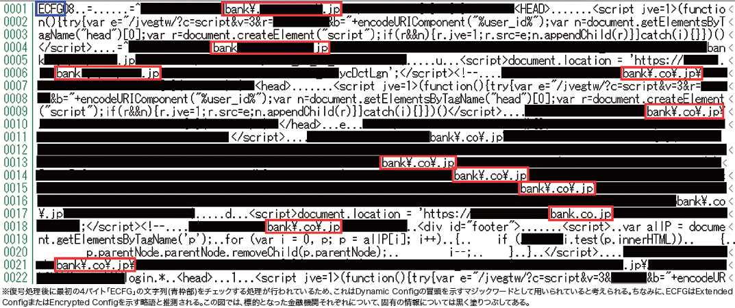 図-14 取得したvawtrakのDynamic Configの一部(復号済み・赤枠部は国内の金融機関などのサービスを示すURL)