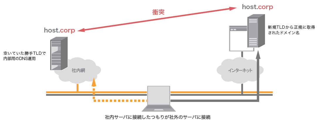 ひとまず動けば良いと、利便のために導入された方式が後々問題を引き起こす場合があります。Name Collision(名前衝突)の問題もこれに該当すると言えます。例えば、社内や家庭内など、管理が明確で特定の人しか利用しない環境では、存在しないTLD(勝手TLD)を用いた独自の内部用ドメイン名空間が利用される場合があります。小規模の場合はhostsファイルなどを利用してホスト名を直接クライアントに登録してしまうこともありますし、クライアント数が増えてくると、社内向けキャッシュサーバやファイアウォールで内部からの勝手TLDの問い合わせに応答するようにDNSを設定し、クライアントを特に設定変更することなく内部用ドメイン名でアクセスできるようにしている場合もあります。設定時には当初の目的を達成し動くように見えるのですが、インターネットは変化し続けており、標準技術を利用して標準以外の設定を行っているとどこかで歪みが生じてしまいます。実は近年、rootゾーンに新規のTLDが追加されており、既にその数は300を越えてまだまだ追加が続いています。ここで内部で利便のために設定していた勝手TLDと追加されたTLDがぶつかると、正規に登録したドメイン名が利用できなかったり意図しないサイトに接続してしまったりといった問題が生じてしまいます。これを名前衝突問題と呼びます(図-1)。問題回避のためには、内部用ドメイン名であっても一意性が担保されたドメイン名を利用することです。既に何らかの登録しているドメイン名があるのならば、そのドメイン名に内部用のサブドメインを設定して利用したり、いっそのこと内部用に新規のドメイン名を登録したりすることで、利用しているドメイン名の一意性が将来にわたって担保できるため安心です。