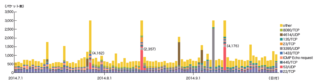 2014年7月から9月の期間中に、ハニーポットに到着した通信の発信元IPアドレスの国別分類を図-5に、その総量(到着パケット数)の推移を図-6に、それぞれ示します。MITFでは、数多くのハニーポットを用いて観測を行っていますが、ここでは1台あたりの平均を取り、到着したパケットの種類(上位10種類)ごとに推移を示しています。また、この観測では、MSRPCへの攻撃のような特定のポートに複数回の接続を伴う攻撃は、複数のTCP接続を1回の攻撃と数えるように補正しています。