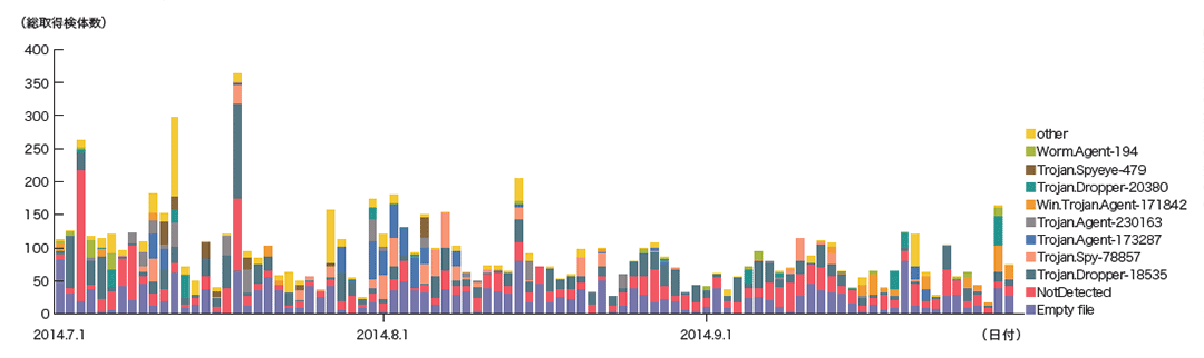 期間中の1日あたりの平均値は、総取得検体数が93、ユニーク検体数が20でした。未検出の検体をより詳しく調査した結果、シンガポールとフィリピンに割り当てられたIPアドレスからパスワードを盗み出すマルウェアなどが観測されました。また、未検出の検体の約54%がテキスト形式でした。これらテキスト形式の多くは、HTMLであり、Webサーバからの404や403によるエラー応答であるため、古いワームなどのマルウェアが感染活動を続けているものの、新たに感染させたPCが、マルウェアをダウンロードしに行くダウンロード先のサイトが既に閉鎖させられていると考えられます。