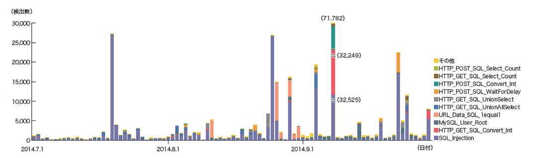 2014年7月から9月までに検知した、Webサーバに対するSQLインジェクション攻撃の発信元の分布を図-10に、攻撃の推移を図-11にそれぞれ示します。これらは、IIJマネージドIPSサービスのシグネチャによる攻撃の検出結果をまとめたものです。