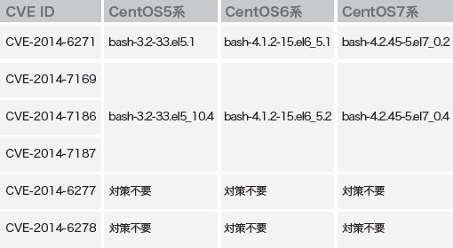 表-2 CentOS各リリースにおける対策版bashパッケージ