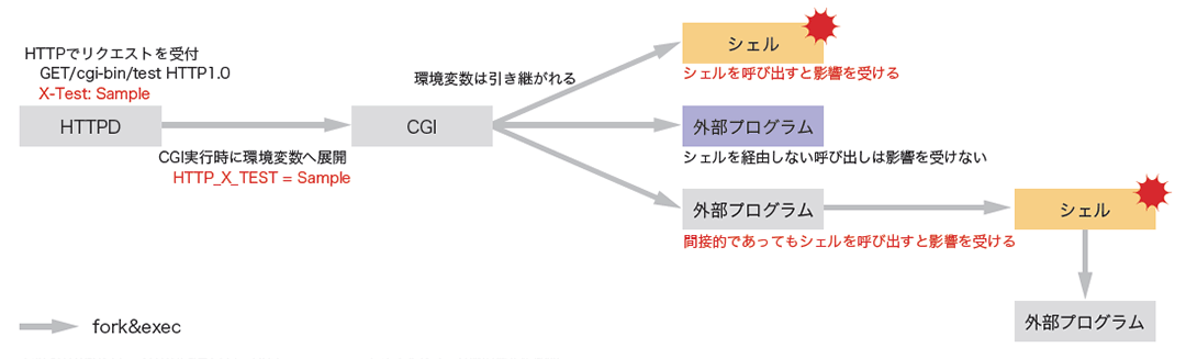 また、アプライアンス製品や組み込み機器の制御OSとしてもLinuxが多く採用されています。身近な物としてはロードバランサ、ホームルータ、ファイルサーバなどが挙げられます。これらにもBashが組み込まれていたり、管理画面においてCGIが使われていたりと、普通のUNIXサーバ同様の影響を受けてしまう場合もあります。これらを踏まえて、今回の脆弱性の影響を理解するにあたり、UNIX環境におけるプログラムの実行と、CGIの処理の流れについて説明します。
