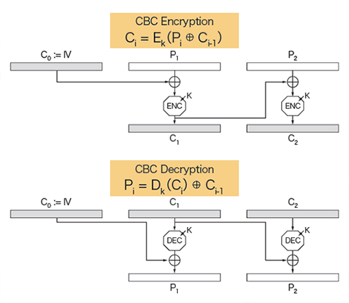POODLE attackはBEAST攻撃と同じく暗号モードとしてCBC(Cipher Block Chaining)モードが利用されたときのみ成功します。RC4をはじめとしたストリーム暗号は、鍵情報をもとに発生させたキーストリームを平文にXOR演算で足しこむことで暗号化を行う方式であり、任意長のデータを暗号化することができます。一方で、DESやAESなどのブロック暗号は定められた入力長(ブロック長:DESは64ビット、AESは128ビット)のデータを暗号化アルゴリズムに入力し、入力長と同じブロック長の暗号文を得る方式です。通常ブロック暗号を利用する際には、ブロック長よりもはるかに長いデータを暗号化しますので、何度も逐次的に暗号化アルゴリズムで暗号処理を行う必要があります。1つ前のブロック暗号処理で得られたデータを次のデータ処理でどのように利用するかを定めた方式のことを暗号モードと呼び、いくつもの方式が提案されています。図-15はその1つであるCBC暗号モード(※60)の概要を示しています。まず初期値としてブロック長のIV(Initial Vector)(※61)を用意します。平文をブロック長ごとに分割したときの最初のパートであるP1にIVをXOR演算で足し合わせたデータに、実際のブロック暗号における暗号化処理を行い、その出力として暗号文C1が得られます。次の平文パートP2を暗号化するには、前のブロック暗号化処理で得られたC1をXOR演算で足し合わせたデータを平文として入力して暗号化し、同様にC2を得ます。このようにCi =ENC(Pi ⊕ Ci-1)という暗号化処理を繰り返すことで、平文全体の暗号化を計算します。逆に復号する際にはPi=DEC(Ci) ⊕ Ci-1という復号処理を逐次的に繰り返すことで、平文を復元することができます。