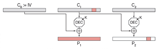 ※ 暗号文の1バイトを改ざんして復号処理した場合には、当該ブロックの平文はブロック全体に渡って影響が及ぶが、次ブロックにおける平文において意図した箇所を改ざんすることが可能である。