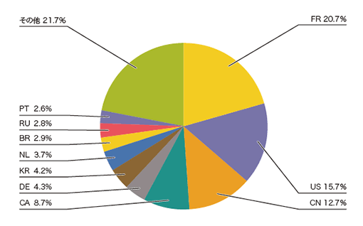 図-3で、DDoS攻撃の対象となったIPアドレスと考えられるbackscatterの発信元の国別分類を見ると、フランスの20.7%が最も大きな割合を占めています。その後は、米国の15.7%、中国の12.7%といった国が続いています。