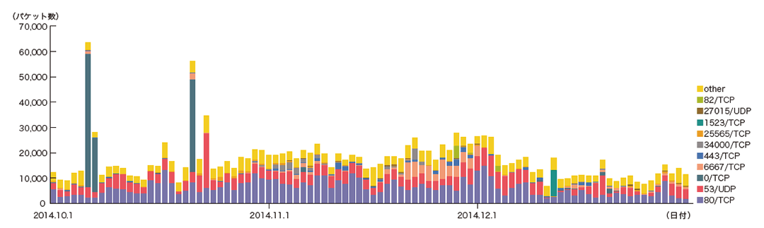 2014年10月から12月の間に観測したbackscatterについて、発信元IPアドレスの国別分類を図-3に、ポート別のパケット数推移を図-4にそれぞれ示します。