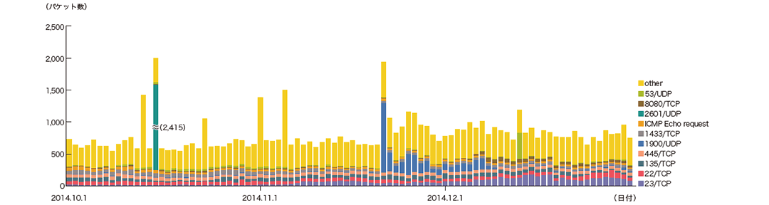11月以降telnet(23/TCP)への通信が増加しています。調査したところ、中国及び日本に割り当てられたIPアドレスから主に受信しています。12月5日より、8080/TCPへの通信が増加しています。これは、QNAP製NAS製品などへのShellshockの脆弱性をついた攻撃であると考えています(※33)。12月13日に53/UDPの通信が大量に発生しています。これらのパケットのほとんどはDNS Amp攻撃の試みを受信したためです(※34)。主にドイツの通信会社に割り当てられたIPアドレスが発信元に偽装されていたことから、このIPアドレスが標的になっていた可能性があります。問い合わせ内容は実在するドメインのAレコードの解決要求でしたが、そのFQDNには約250ものAレコードが設定されていました。これにより、送信元を偽装してこの多くのAレコードが設定されたドメインを名前解決することで、応答が増幅されて返るため、結果としてDNS Amp攻撃になります。10月15日に中国に割り当てられた1つのIPアドレスから、特定のハニーポットのIPアドレスに対して2601/UDPに対する通信が行われています。この通信の調査を行ったところ、長さは50バイトから800バイト前後のランダムなデータが短時間に繰り返し送信されていましたが、その意図は不明です。