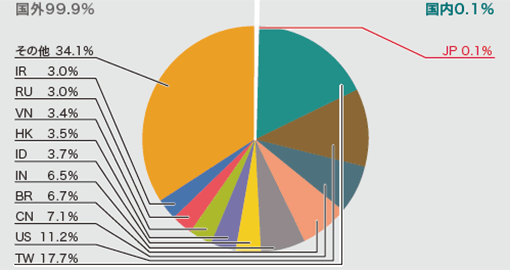 発信元の分布では、日本30.8%、米国13.5%、中国13.4%となり、以下その他の国々が続いています。Webサーバに対するSQLインジェクション攻撃の発生件数は前回に比べて減少しましたが、これは前回期間で中国を発信元とする攻撃が大幅に増加していたことによるもので、全体の検知傾向に変化はありませんでした。
