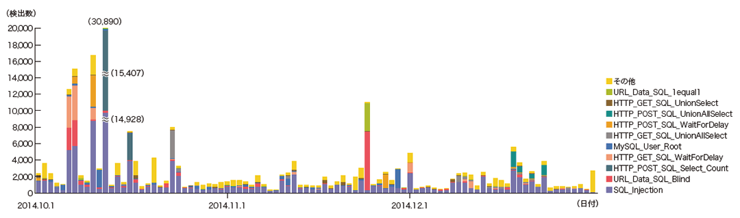 2014年10月から12月までに検知した、Webサーバに対するSQLインジェクション攻撃の発信元の分布を図-10に、攻撃の推移を図-11にそれぞれ示します。これらは、IIJマネージドIPSサービスのシグネチャによる攻撃の検出結果をまとめたものです。