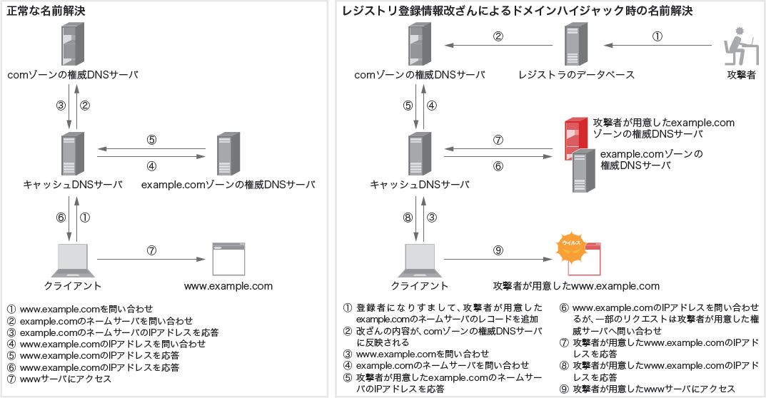 改ざんされるデータは、レジストリのWHOISサーバに登録されているネームサーバや権威DNSサーバに登録されているNSレコード及びグルーレコードです。
