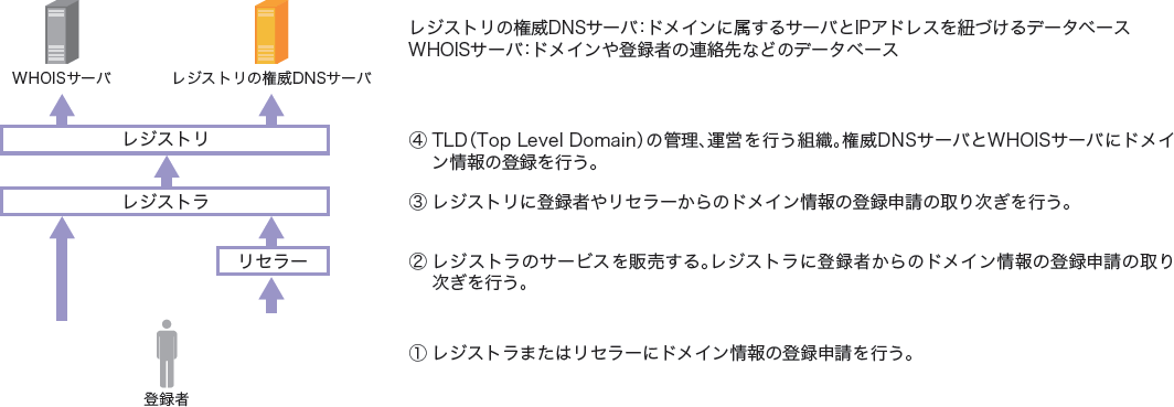 ドメインに関する情報はTLDを運用・管理するレジストリという組織のデータベースに登録されています。ドメインを登録するには、レジストラと呼ばれる仲介業者(またはレジストラのサービスを再販するリセラー)のサービスを利用して、レジストリにドメインの登録申請を行います。ドメインの登録情報は図-14の矢印の順番で受け渡され、レジストリの権威DNSサーバとWHOISサーバに登録されます。