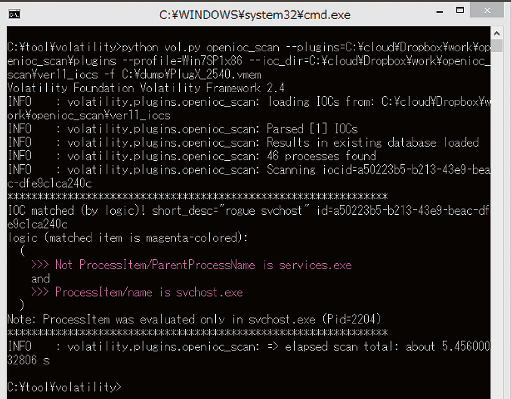 IOCを定義したら、図-17のように、その定義ファイルが存在するフォルダをioc_dirオプションで指定してopenioc_scanを実行します。各termの評価結果をAND/ORで組み合わせた結果、原則的に真になる場合、そのIOCと真になったtermを色付きで表示します。この図では、プロセスIDが2204のsvchost.exeが、条件にマッチしたプロセスであることが分かります。ところで、Volatility FrameworkはRedlineと異なり、メモリイメージの解析結果をキャッシュしませんが、openioc_scanは各termの評価に必要な情報を都度キャッシュするため、同じtermを二度目以降に評価した場合は高速に処理することが可能です(※59)。