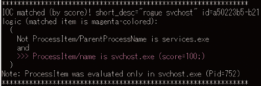 OpenIOC 1.1ではparameterという概念を使い、termごとにメタデータを定義することができます。openioc_scanはそのparameterを用いて、スコアリングでの評価をサポートしています。例えば、先の例のIOCを評価した際、片方のtermのみ真であっても、parameterとして定義したスコアが閾値を超えている場合、そのスコアに基づきIOCにマッチしたことが表示されます。具体的には、parameterにセットされていたscoreが整数値で合計100を超える場合、図-18のように該当するIOCが表示されます。openioc_scanはそのほかにdetailやnoteというparameterをサポートしています(※61)。
