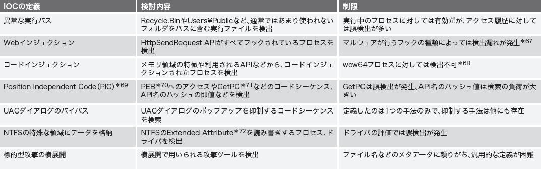 表-2に検討結果をまとめます。汎用的な定義である以上、誤検出を完全に避けることはできないため、誰しもが今回検討したIOCを使って未知の脅威を検出できるわけではありませんが、更なる詳細な解析を行っていくための優先順位づけ(トリアージ)という観点では、ある程度活用できるという感触を得ました。一方、Volatility Framework自体の機能の制約によって、検出漏れが発生しているケースも見受けられました。