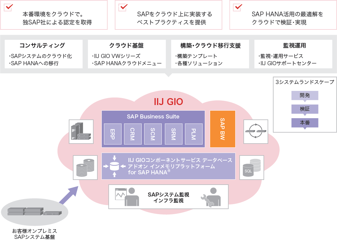 2015年4月、「IIJ GIOコンポーネントサービス データベースアドオン インメモリプラットフォーム for SAP HANA®」の提供を開始します。これは、クラウド上でSAP社の提供するインメモリデータベース、SAP HANA®の本番環境を運用することができるサービスです。既に2014年6月に、事前検証用クラウド環境「IIJ GIO for SAPソリューション PoC for SAP HANA®」(図-1)の提供を開始していますが、今回はその本番環境向けのサービスになります。IIJは、「SAP Certified in Hosting Services」及び「SAP Certified in Cloud Services」(※1)を取得しており、SAPの本番環境で安心して利用できる高いサービスレベルと、セキュリティを提供します。初期投資、運用コストを抑え、経営判断に即応するシステムの迅速な開発・展開を実現します。