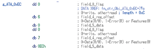 また、nls_933w.dll内に存在する、ATAデバイスのレジスタの読み書きに用いる6バイトの構造体から成るバイナリシーケンスを定義することも、nls_933w.dllに特化した検出であれば有効です。この構造体は、レジスタオフセットや書き込むデータなどで構成され、例えばHDDの情報を取得するためのコマンド(IDENTIFY DEVICE)の場合、図-17のように2つの構造体(合計で12バイト)のバイナリシーケンスとしてメモリ上に存在しています。その他にもATAコマンドを含む構造体がモジュールに数多く含まれているので、それらをANDで組み合わせて定義します。一方ドライバの側にはこのような構造体は含まれていませんが、その構造体をパースするコードシーケンスを定義するのも1つの手でしょう。