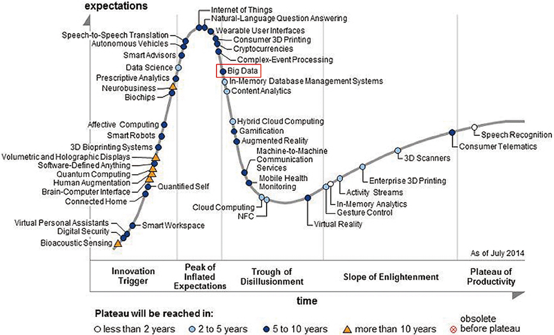 「ビッグデータ」という言葉は「クラウド・コンピューティング」などと同じように非常にコンセプチュアルな用語です。定義が曖昧模糊としていて意味するところが時間の経過と共に変化していくので、非常に感覚的に使われることが多いです。それ故に長く生き残っていく用語だと思います。しかし、流行りすたりのあるバズワードとしての「ビッグデータ」は、2015年の現在、賞味期限切れを迎えつつあるように感じられます。この印象は、イギリスのシンクタンクであるガートナーが毎年発表しているハイプサイクルでも、2014年には「ビッグデータ」は幻滅期に突入していることから、それなりに裏付けのある話でしょう(図-1)。