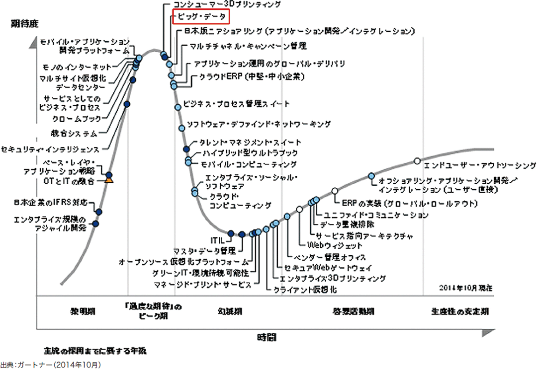 もっとも日本国内に限定したハイプサイクルでは流行期の最後に位置するので、バズワードとしての「ビッグデータ」は実に微妙な立ち位置にあるのかもしれません(図-2)。