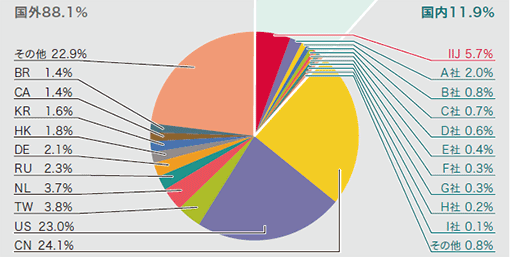 攻撃元の分布としては、多くの場合、国内、国外を問わず非常に多くのIPアドレスが観測されました。これは、IPスプーフィング(※31)の利用や、DDoS攻撃を行うための手法としてのボットネット(※32)の利用によるものと考えられます。