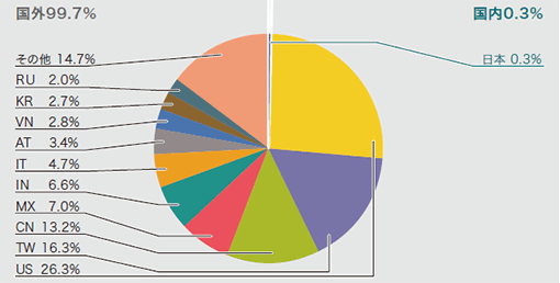 図-7 検体取得元の分布(国別分類、全期間、Confickerを除く)