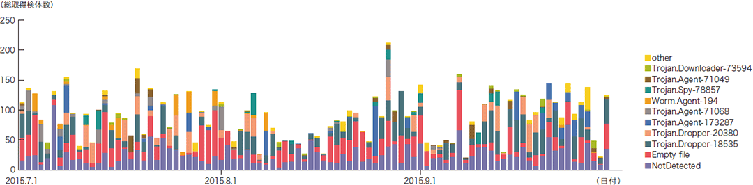 同じ期間中でのマルウェアの検体取得元の分布を図-7に、マルウェアの総取得検体数の推移を図-8に、そのうちのユニーク検体数の推移を図-9にそれぞれ示します。このうち、図-8と図-9では、1日あたりに取得した検体(※37)の総数を総取得検体数、検体の種類をハッシュ値(※38)で分類したものをユニーク検体数としています。また、検体をウイルス対策ソフトで判別し、上位10種類の内訳をマルウェア名称別に色分けして示しています。なお、図-8と図-9は前回同様に複数のウイルス対策ソフトウェアの検出名によりConficker判定を行い、Confickerと認められたデータを除いて集計しています。