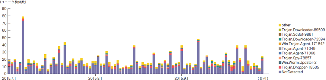 本レポート期間中、Confickerを含む1日あたりの平均値は、総取得検体数が27,935、ユニーク検体数は543でした。7月に米国からの感染が増加したものの、その後は減少に転じており、短期間での増減を繰り返しながら、総取得検体数で99.5%、ユニーク検体数で98.8%を占めています。このように、今回の対象期間でも支配的な状況が変わらないことから、Confickerを含む図は省略しています。本レポート期間中の総取得検体数は前回の対象期間と比較し、約44%増加し、ユニーク検体数は前号から約10%減少しました。総取得権対数の増加は、本レポートの期間中、米国に割り当てられたIPアドレスからの感染活動が増加したためです。Conficker Working Groupの観測記録(※41)によると、2015年10月1日現在で、ユニークIPアドレスの総数は675,680とされています。2011年11月の約320万台と比較すると、約21%に減少したことになりますが、依然として大規模に感染し続けていることが分かります。