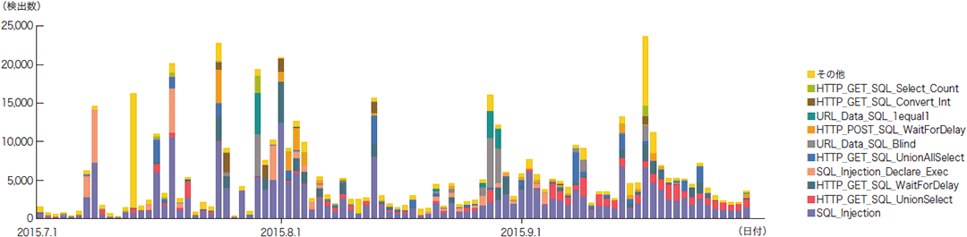 2015年7月から9月までに検知した、Webサーバに対するSQLインジェクション攻撃の発信元の分布を図-10に、攻撃の推移を図-11にそれぞれ示します。これらは、IIJマネージドIPSサービスのシグネチャによる攻撃の検出結果をまとめたものです。発信元の分布では、日本28.2%、米国28.1%、中国20.3%となり、以下その他の国々が続いています。Webサーバに対するSQLインジェクション攻撃の発生件数は、前回に比べて大幅に増加しました。これは、日本や米国からの攻撃が増加したためです。